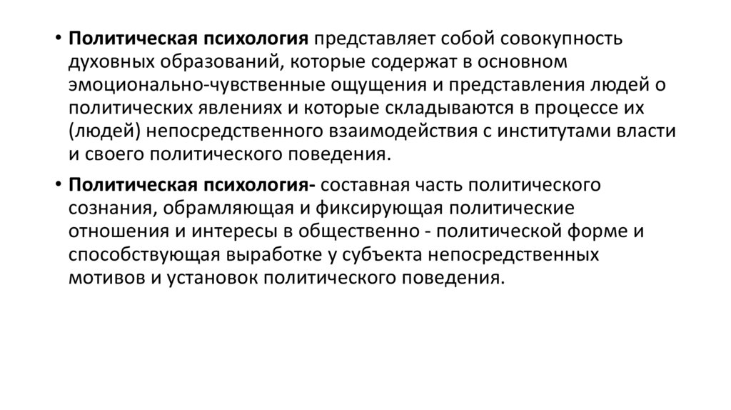 • Политическая психология представляет собой совокупностьдуховных образований, которые содержат в основном
