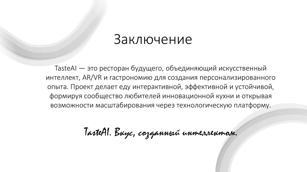 ЗаключениеTasteAI — это ресторан будущего, объединяющий искусственный