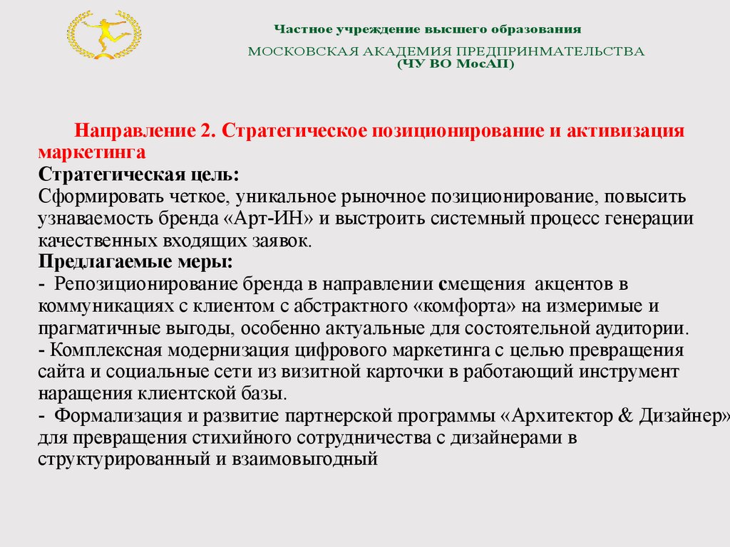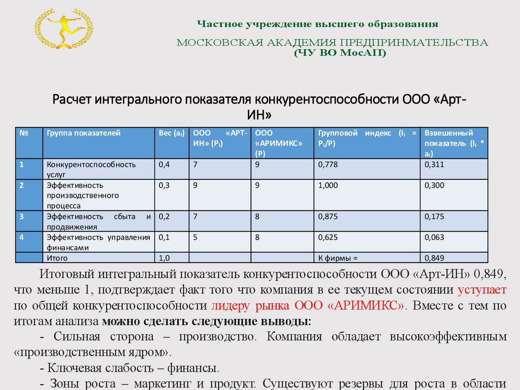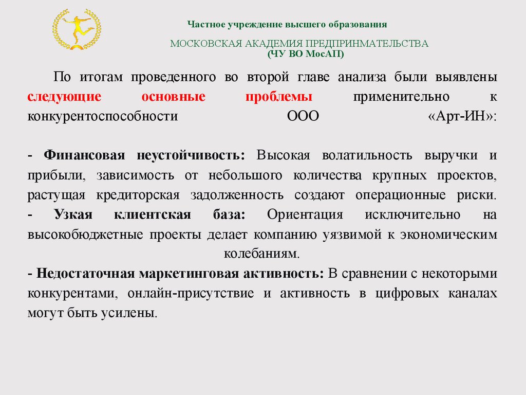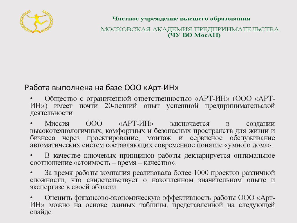 «Арт-ИН», включая объективную оценку её уровня и разработку путей