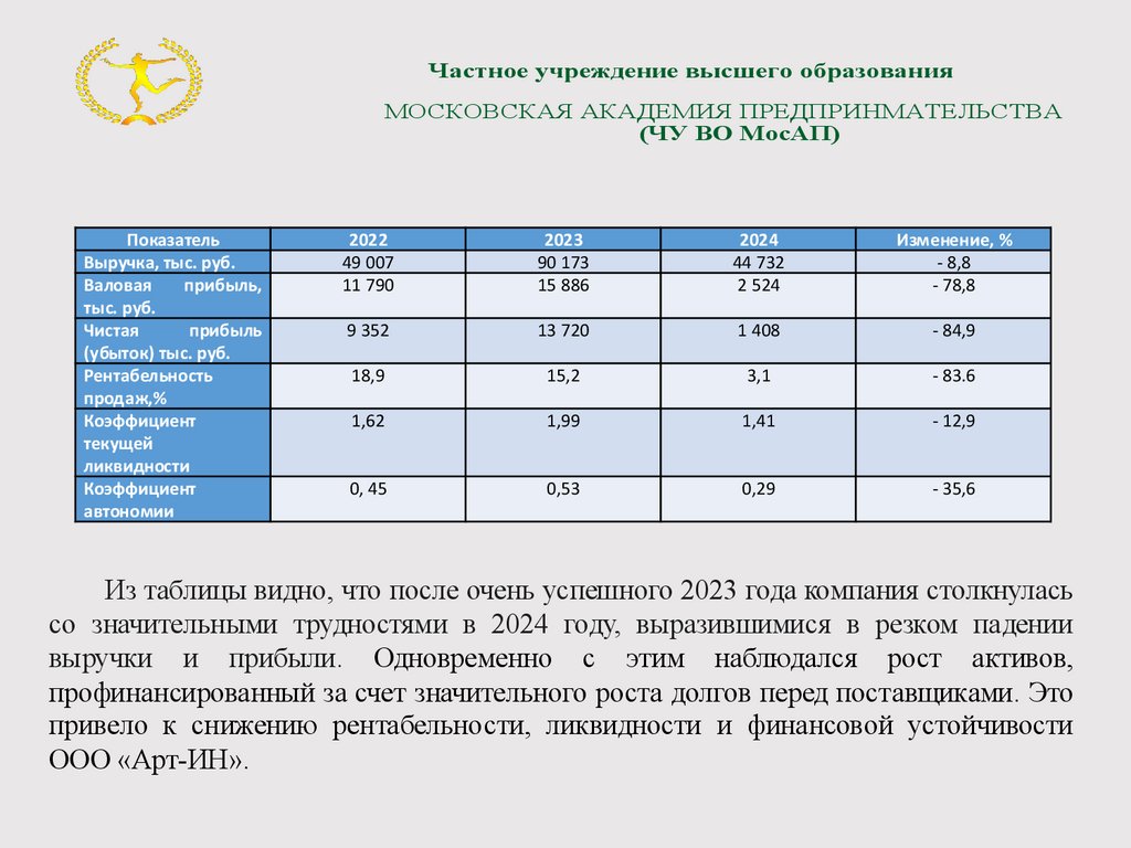 привело к снижению рентабельности, ликвидности и финансовой устойчивости