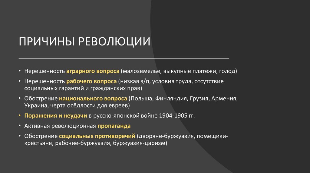 ПРИЧИНЫ РЕВОЛЮЦИИ• Нерешенность аграрного вопроса (малоземелье, выкупные платежи, голод)