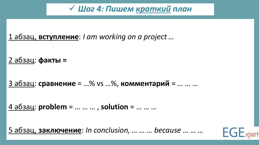 Шаг 4: Пишем краткий план1 абзац, вступление: I am working on a project …