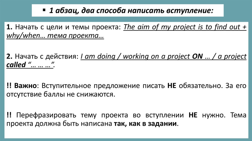 1 абзац, два способа написать вступление:1. Начать с цели и темы проекта: The aim of my project is to find out +