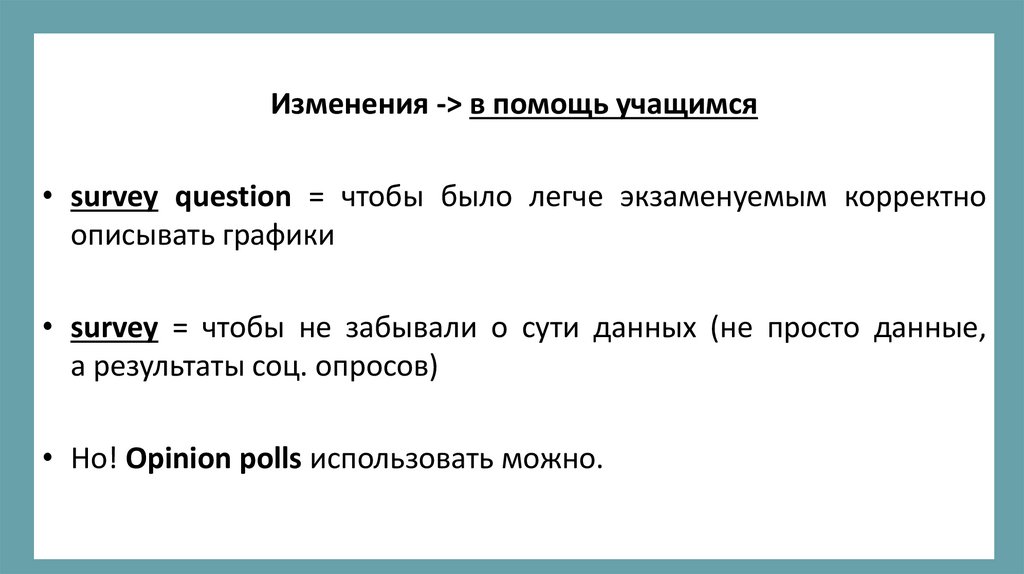 Изменения -> в помощь учащимся• survey question = чтобы было легче экзаменуемым корректно