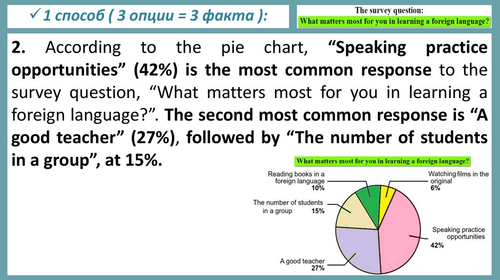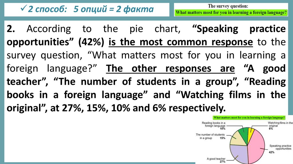 2. According to the pie chart, “Speaking practice opportunities” (42%) is the most common response to