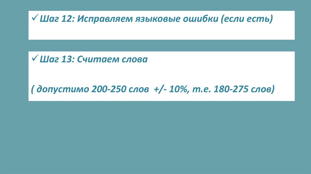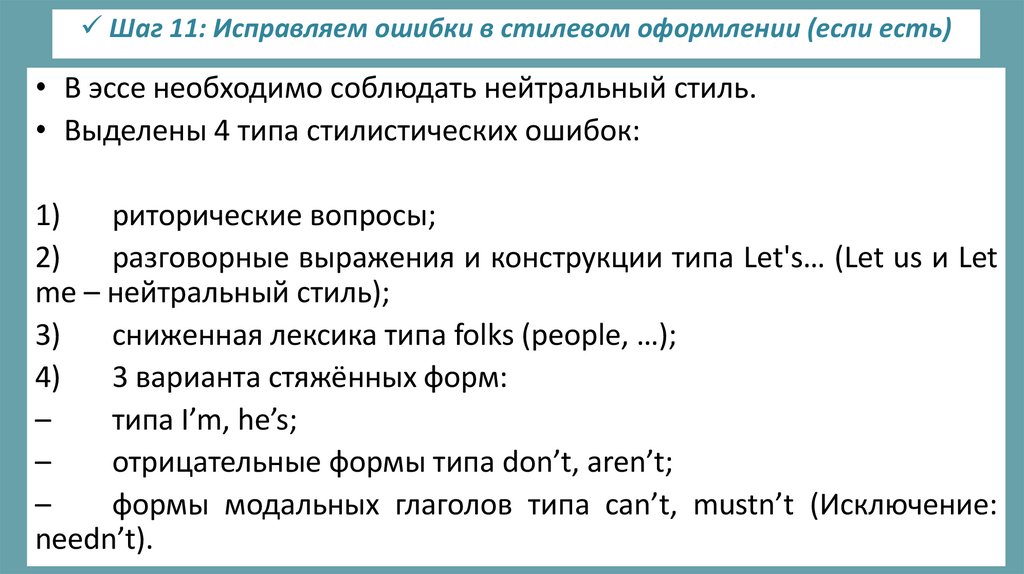 Шаг 11: Исправляем ошибки в стилевом оформлении (если есть)• В эссе необходимо соблюдать нейтральный стиль.
