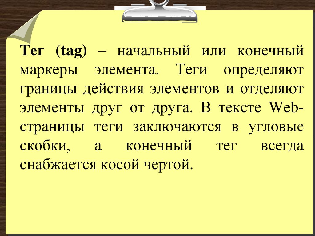 Тег (tag) – начальный или конечныймаркеры элемента. Теги определяют