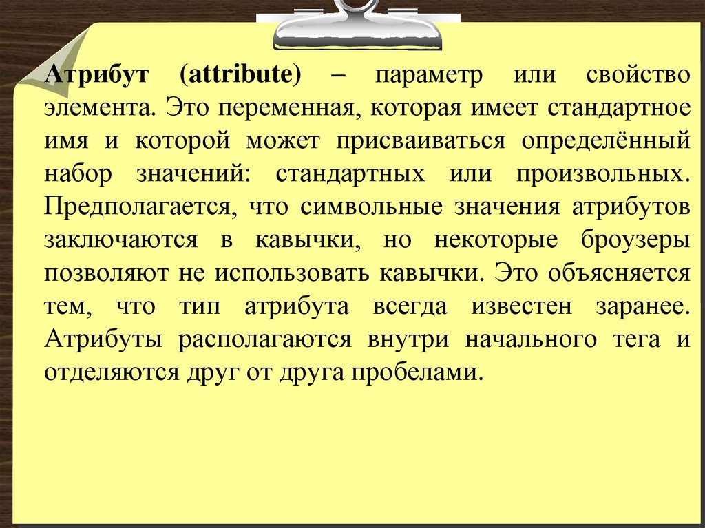 Атрибут (attribute) – параметр или свойствоэлемента. Это переменная, которая имеет стандартное