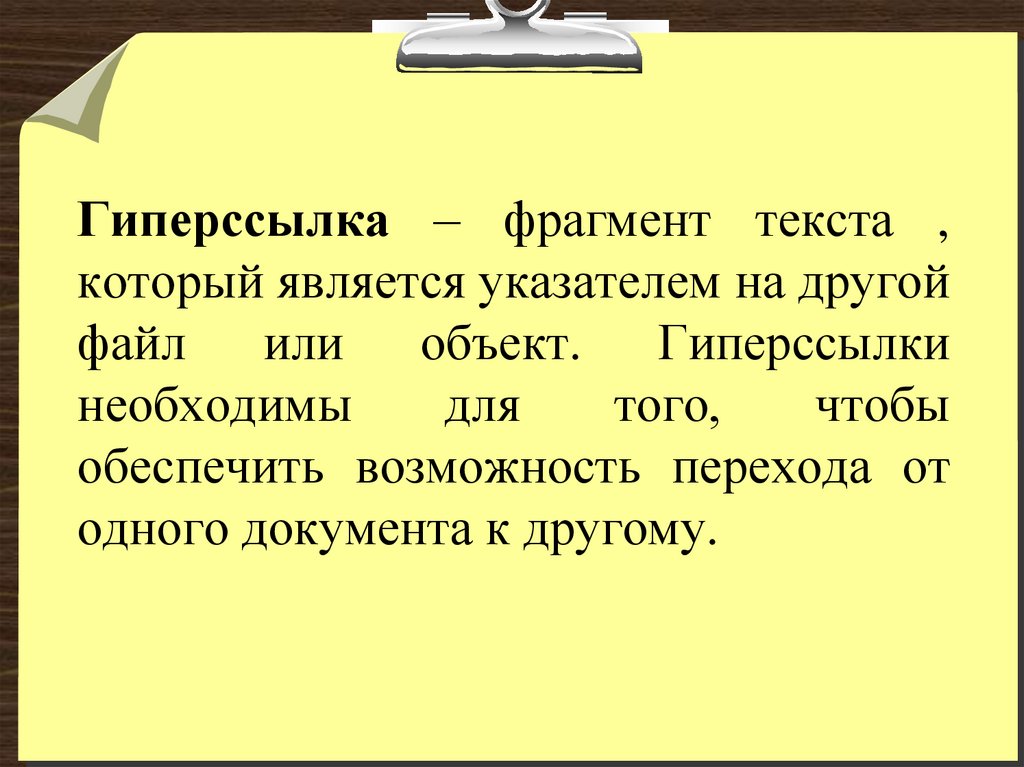 Гиперссылка – фрагмент текста ,который является указателем на другой