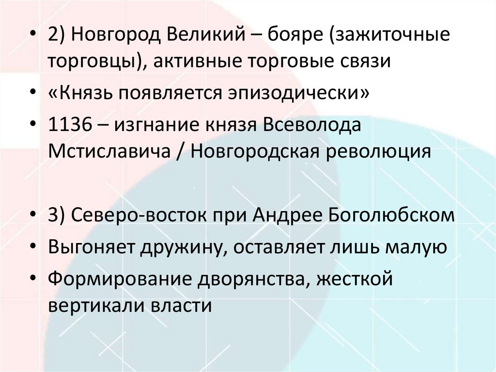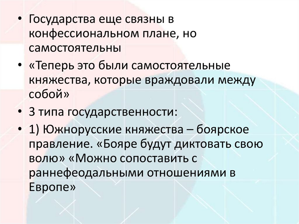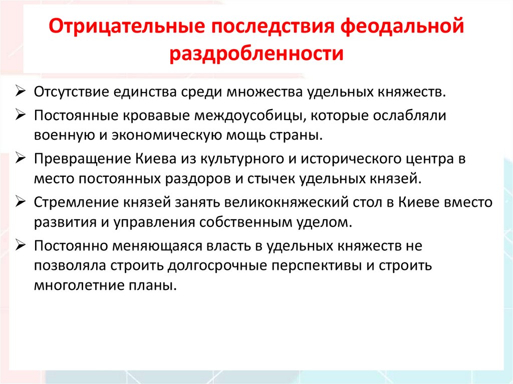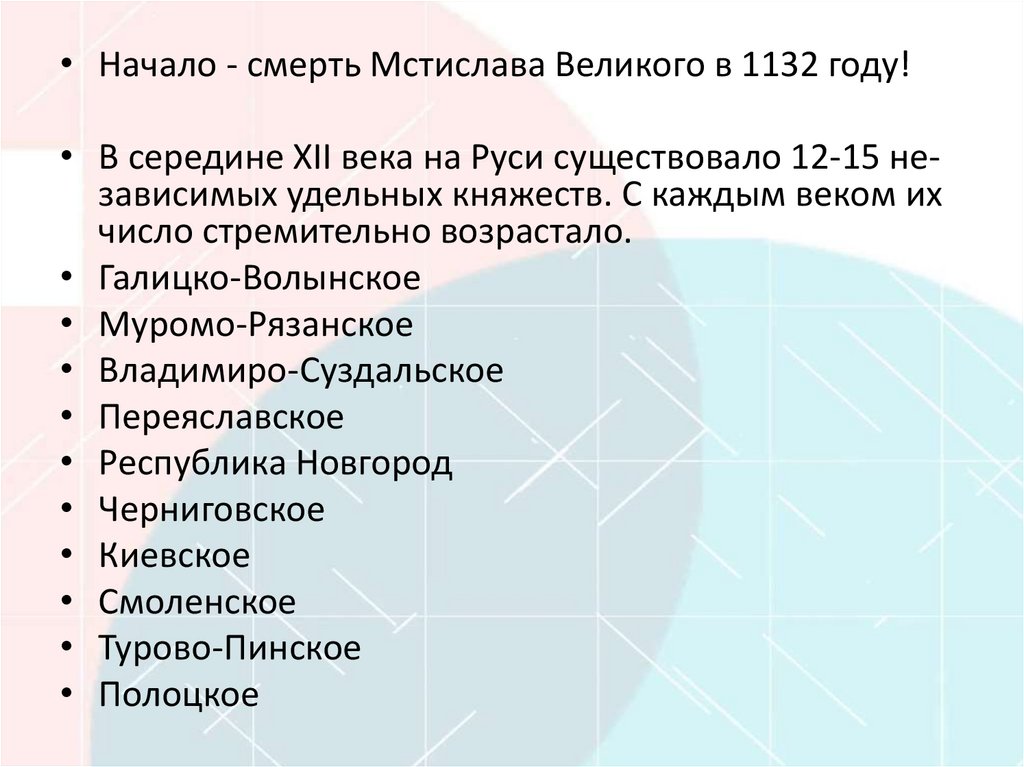 • Начало - смерть Мстислава Великого в 1132 году!• В середине XII века на Руси существовало 12-15 независимых удельных княжеств. С каждым веком их