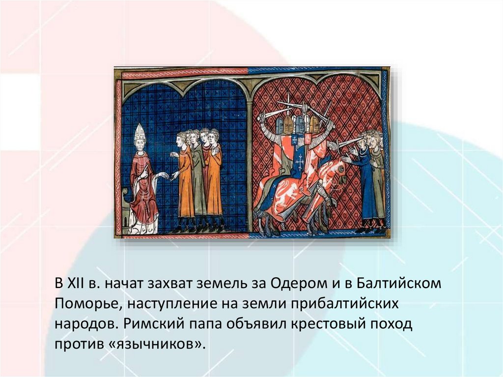 В XII в. начат захват земель за Одером и в БалтийскомПоморье, наступление на земли прибалтийских