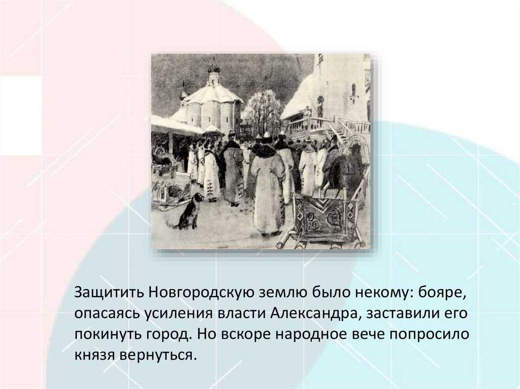 Защитить Новгородскую землю было некому: бояре,опасаясь усиления власти Александра, заставили его