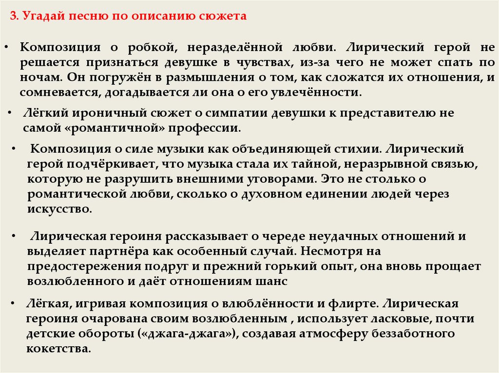 3. Угадай песню по описанию сюжета• Композиция о робкой, неразделённой любви. Лирический герой не