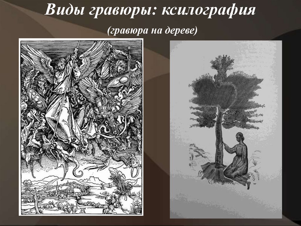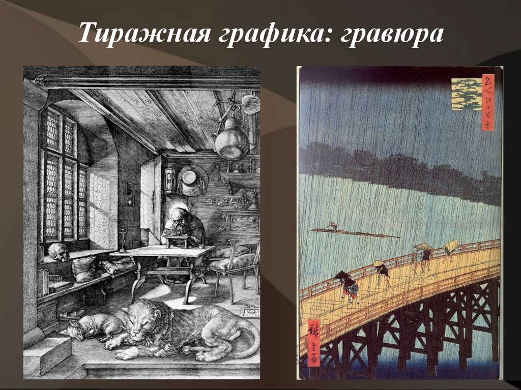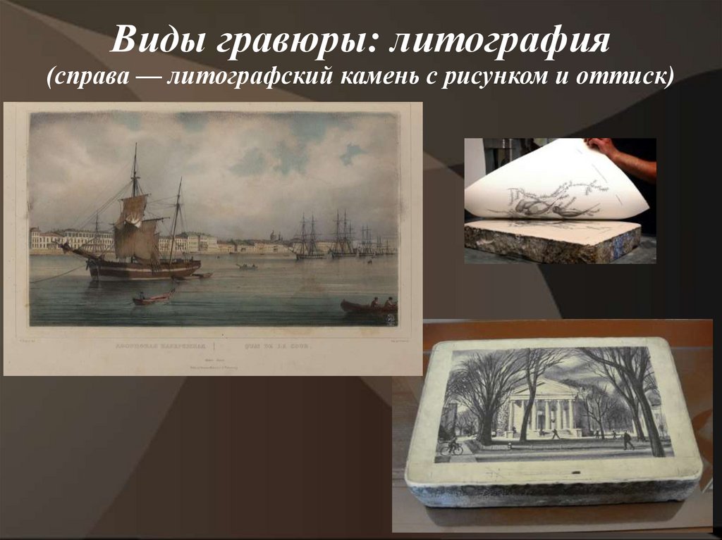 Виды гравюры: литография(справа — литографский камень с рисунком и оттиск)