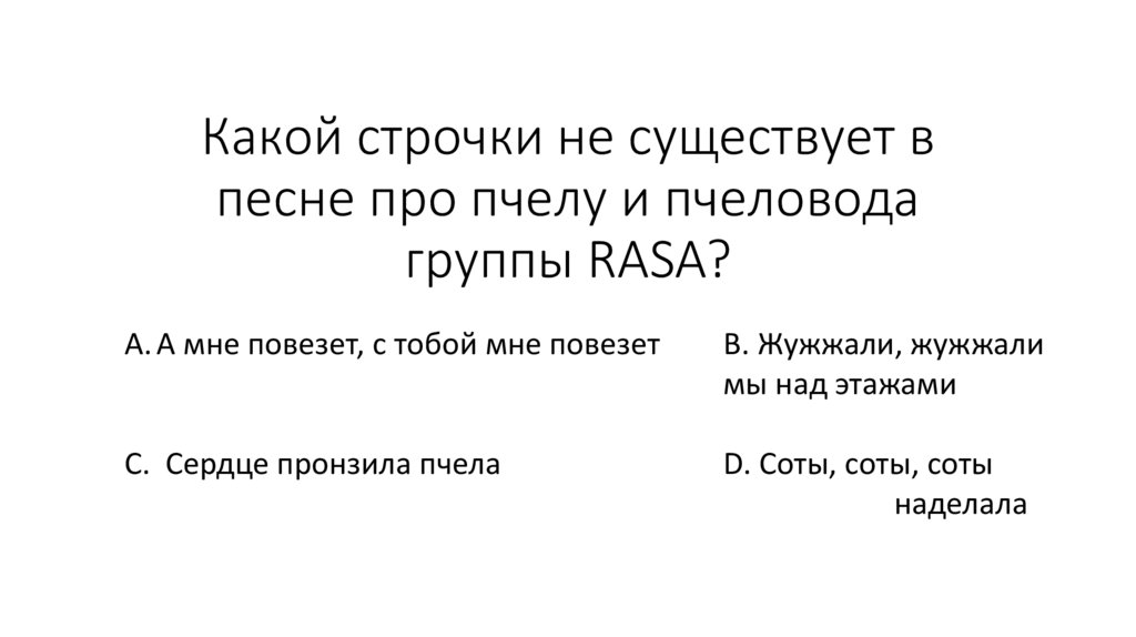 1. Какой строчки не существует в песне про пчелу и пчеловода группы RASA?