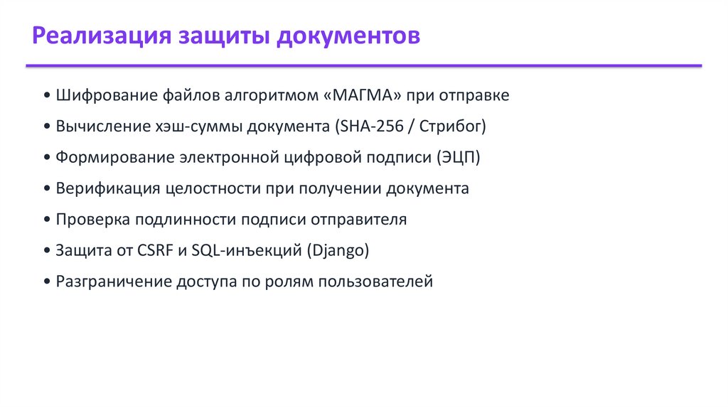 Реализация защиты документов• Шифрование файлов алгоритмом «МАГМА» при отправке
