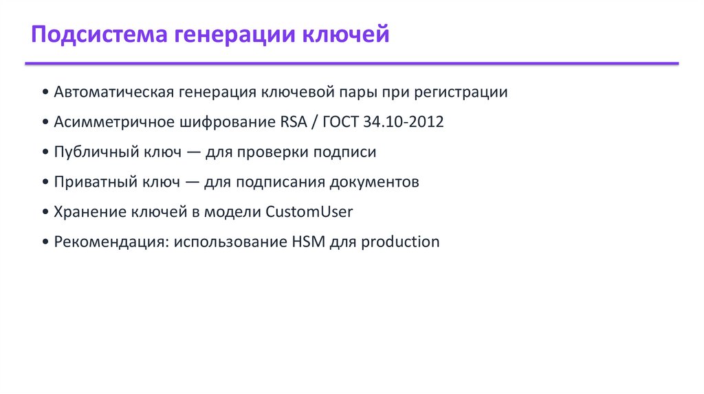Подсистема генерации ключей• Автоматическая генерация ключевой пары при регистрации