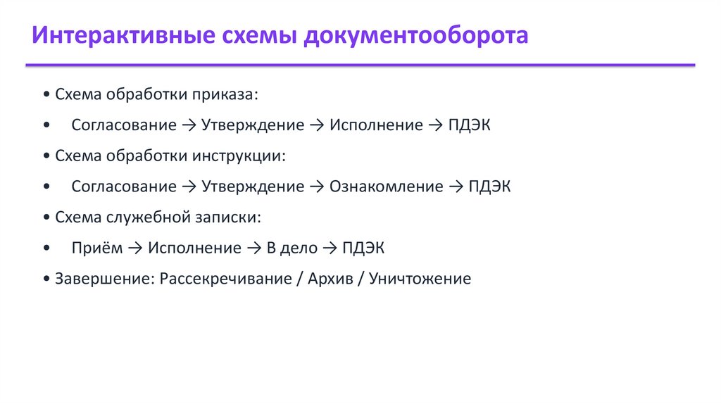 Интерактивные схемы документооборота• Схема обработки приказа: