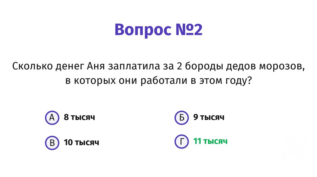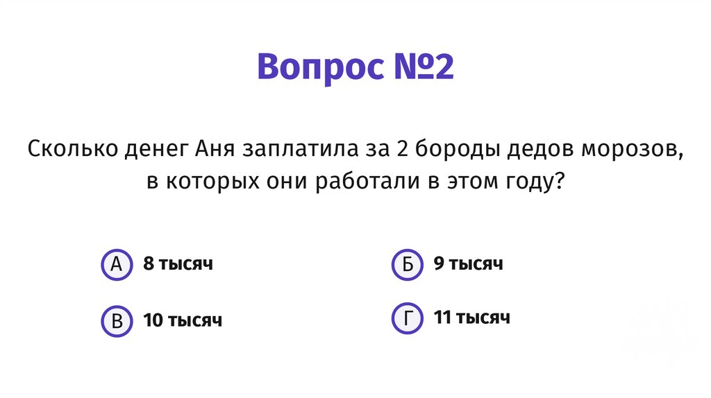 Вопрос №2Сколько денег Аня заплатила за 2 бороды дедов морозов,