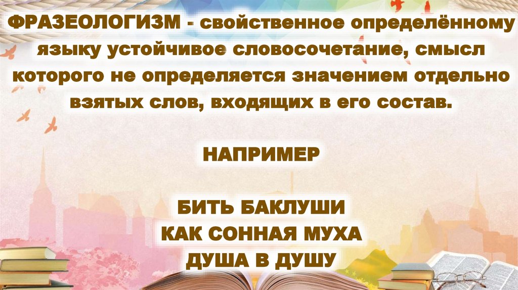 ФРАЗЕОЛОГИЗМ - свойственное определённомуязыку устойчивое словосочетание, смысл