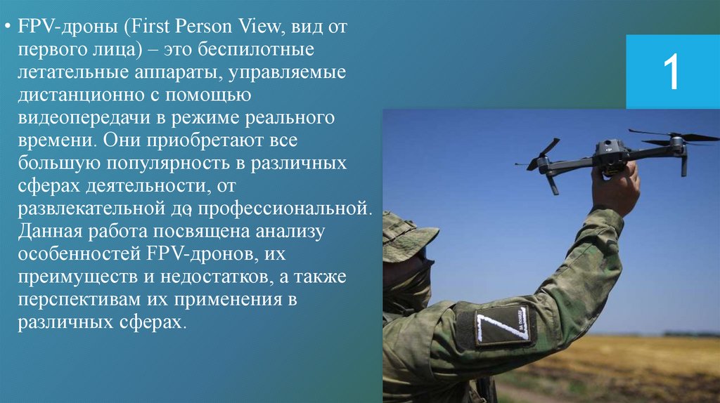 • FPV-дроны (First Person View, вид отпервого лица) – это беспилотные