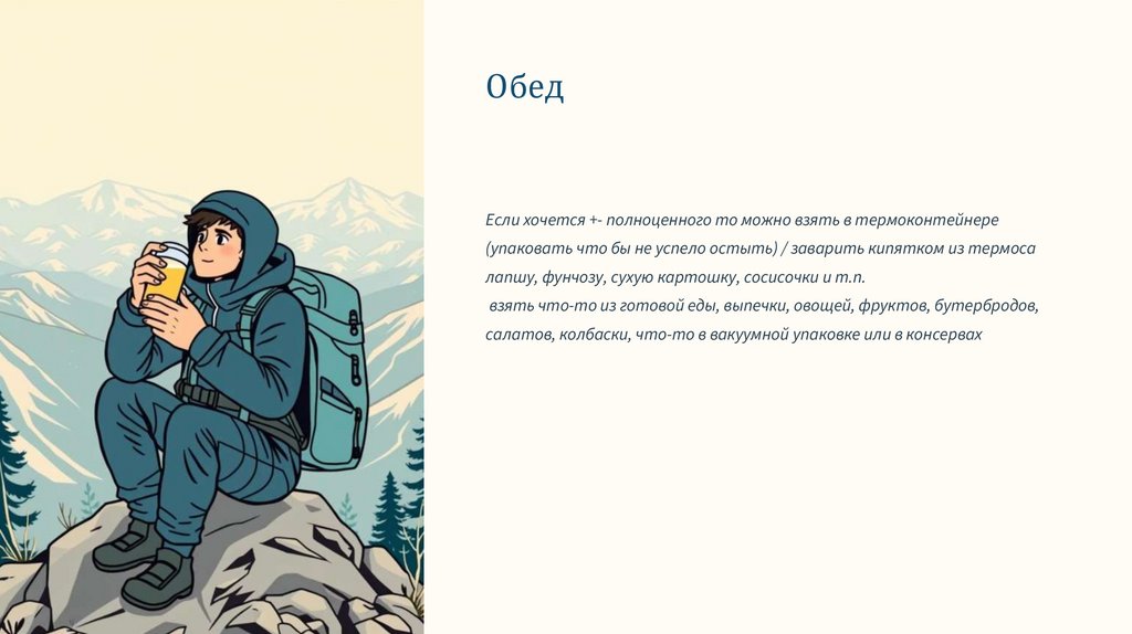 ОбедЕсли хочется +- полноценного то можно взять в термоконтейнере