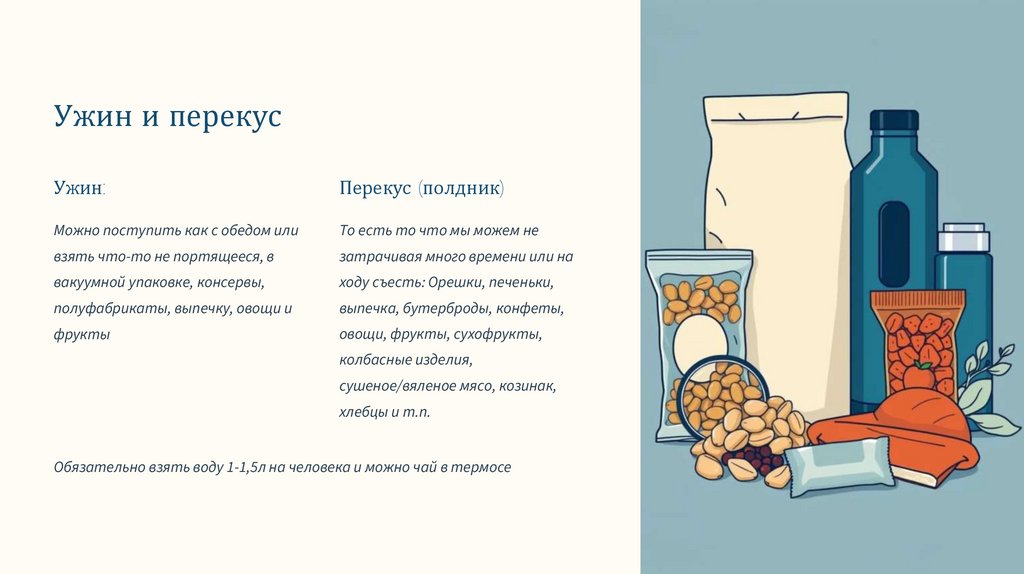 Обязательно взять воду 1-1,5л на человека и можно чай в термосе
