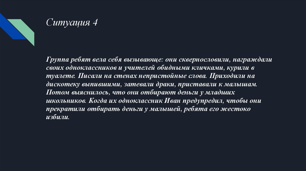 Ситуация 4Группа ребят вела себя вызывающе: они сквернословили, награждали