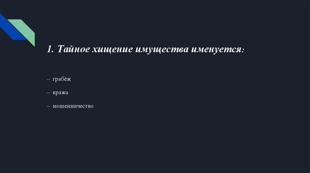 1. Тайное хищение имущества именуется:– грабёж