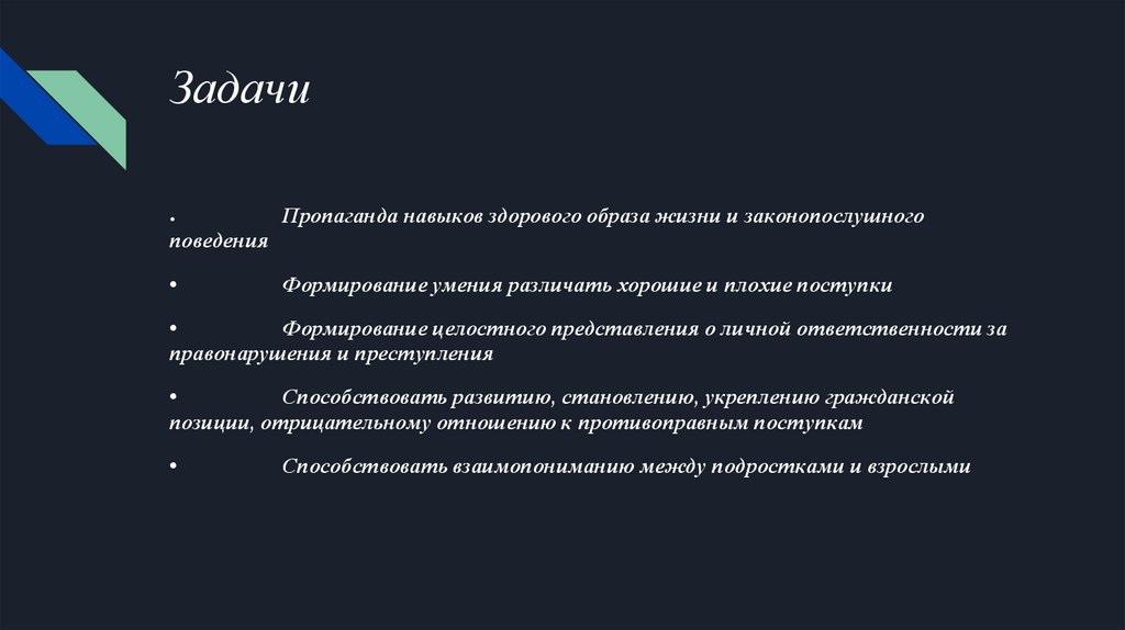 ЗадачиПропаганда навыков здорового образа жизни и законопослушного