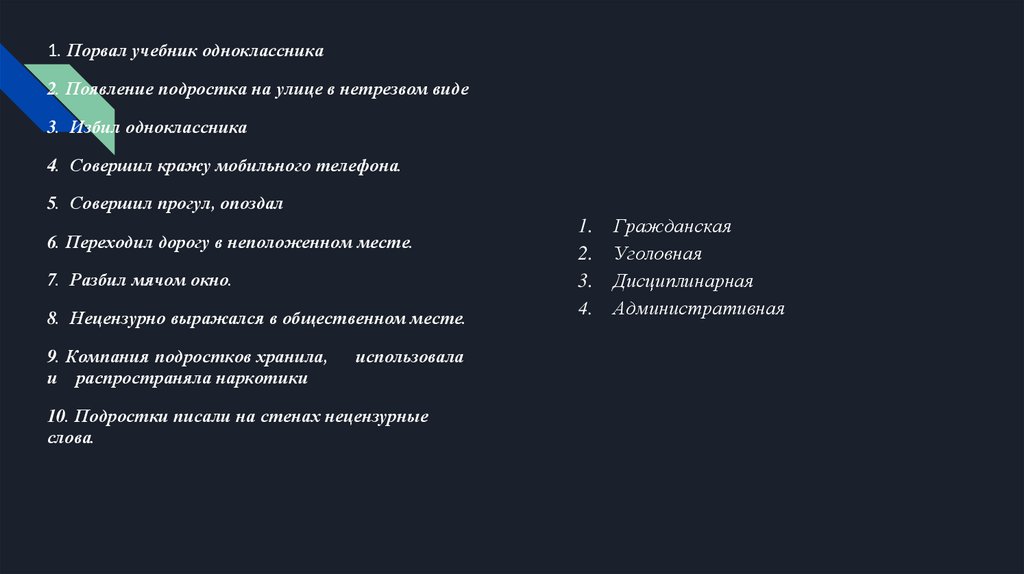 1. Порвал учебник одноклассника2. Появление подростка на улице в нетрезвом виде
