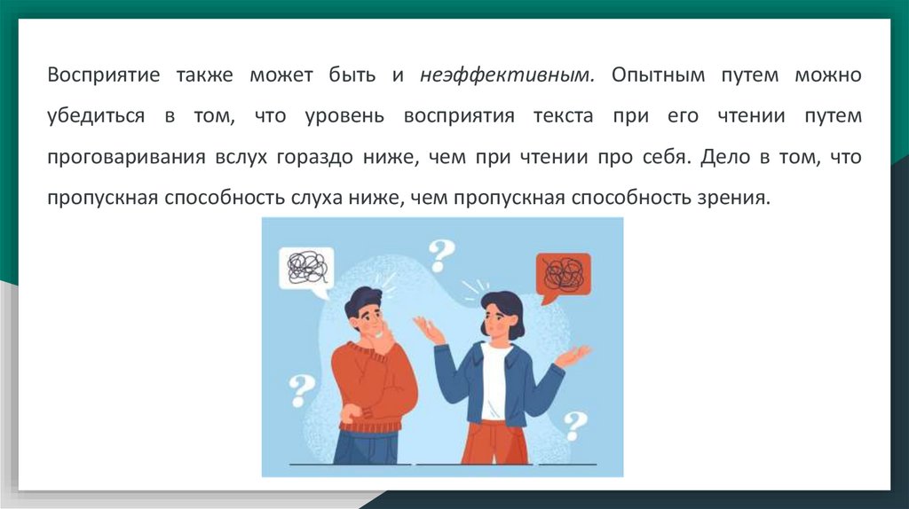 Восприятие также может быть и неэффективным. Опытным путем можноубедиться в том, что уровень восприятия текста при его чтении путем