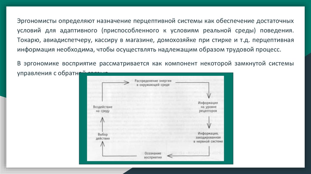 В эргономике восприятие рассматривается как компонент некоторой замкнутой системы