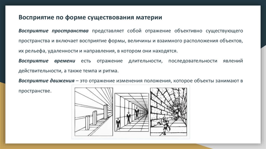 Восприятие по форме существования материиВосприятие пространства представляет собой отражение объективно существующего