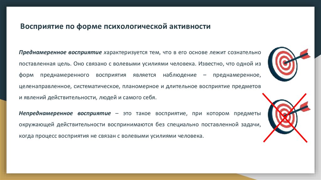 Восприятие по форме психологической активностиПреднамеренное восприятие характеризуется тем, что в его основе лежит сознательно