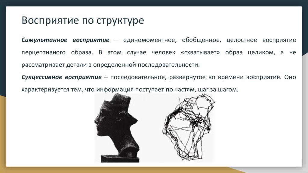 Восприятие по структуреСимультанное восприятие – единомоментное, обобщенное, целостное восприятие