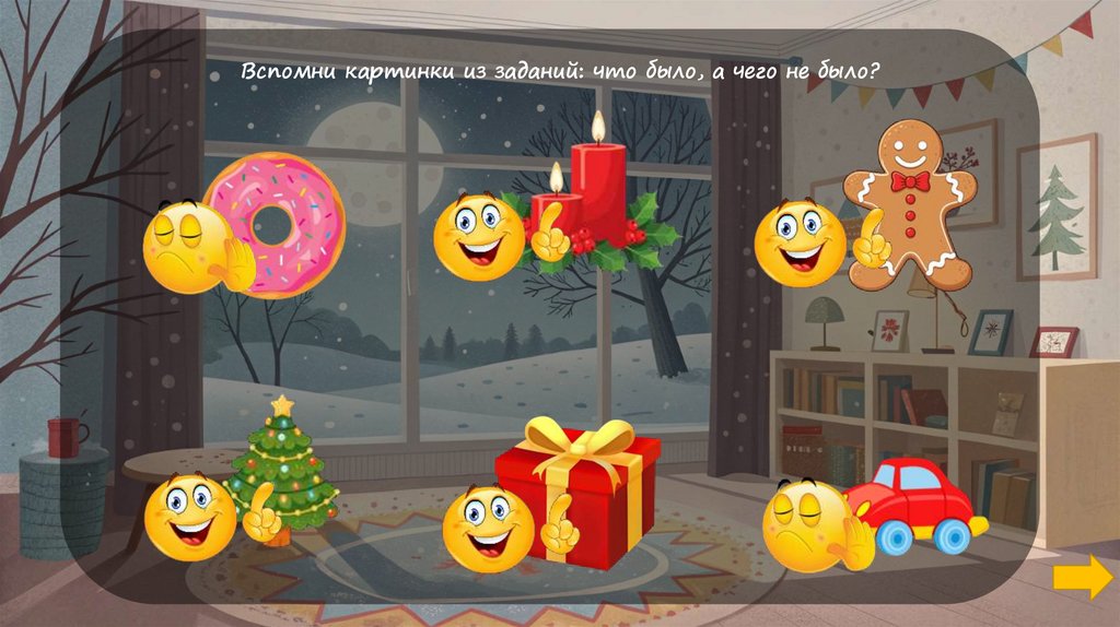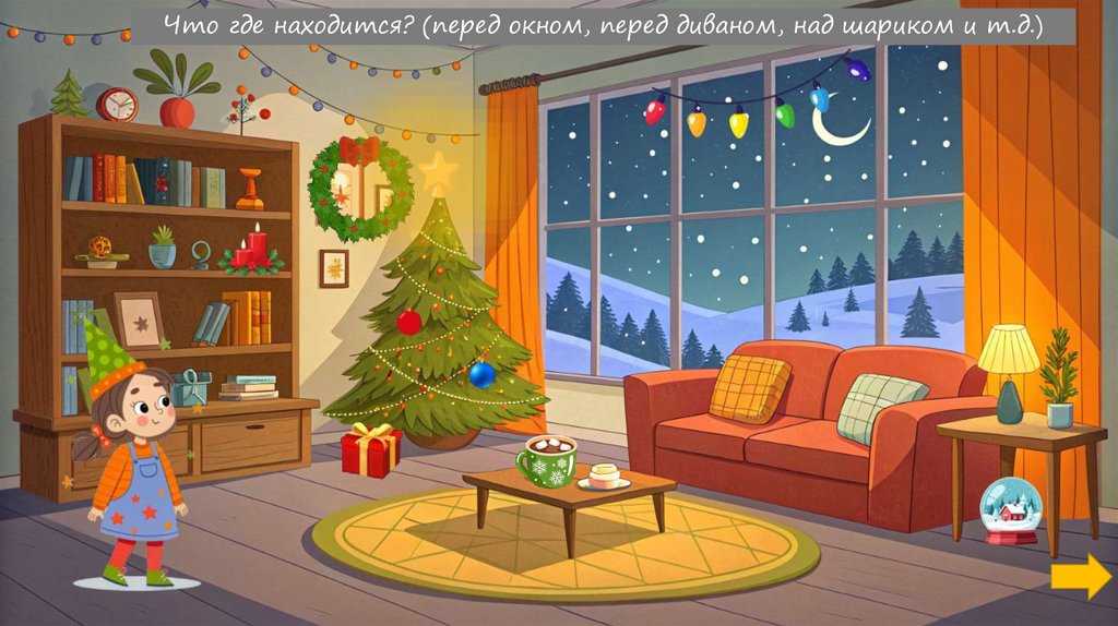 Что где находится? (перед окном, перед диваном, над шариком и т.д.)3.