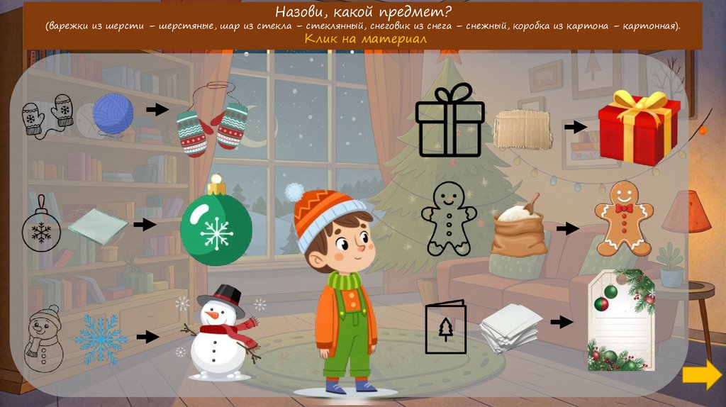 Назови, какой предмет?(варежки из шерсти – шерстяные, шар из стекла – стеклянный, снеговик из снега – снежный, коробка из картона – картонная).