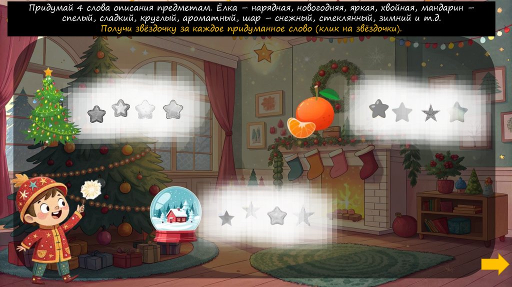 Придумай 4 слова описания предметам. Ёлка – нарядная, новогодняя, яркая, хвойная, мандарин –спелый, сладкий, круглый, ароматный, шар – снежный, стеклянный, зимний и т.д.