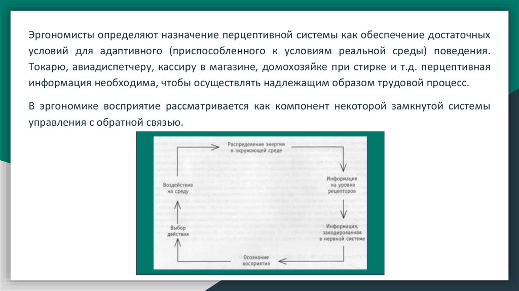 В эргономике восприятие рассматривается как компонент некоторой замкнутой системы