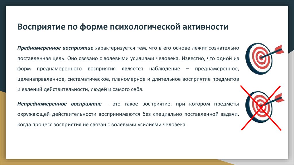 Восприятие по форме психологической активностиПреднамеренное восприятие характеризуется тем, что в его основе лежит сознательно