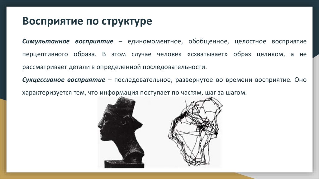 Восприятие по структуреСимультанное восприятие – единомоментное, обобщенное, целостное восприятие