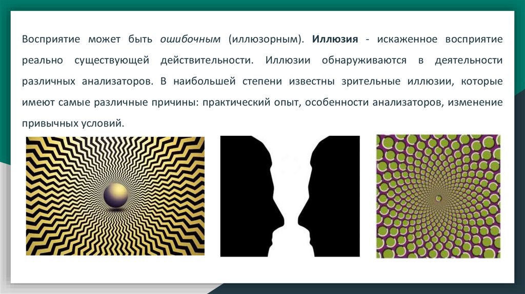 Восприятие может быть ошибочным (иллюзорным). Иллюзия - искаженное восприятиереально существующей действительности. Иллюзии обнаруживаются в деятельности