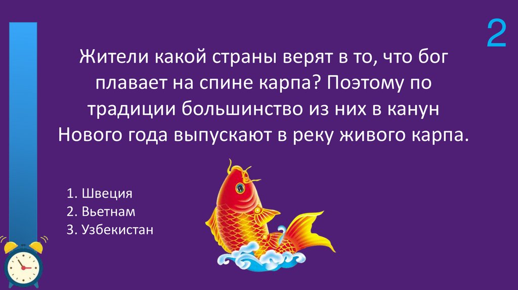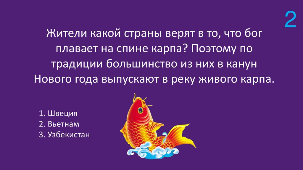 Жители какой страны верят в то, что богплавает на спине карпа? Поэтому по