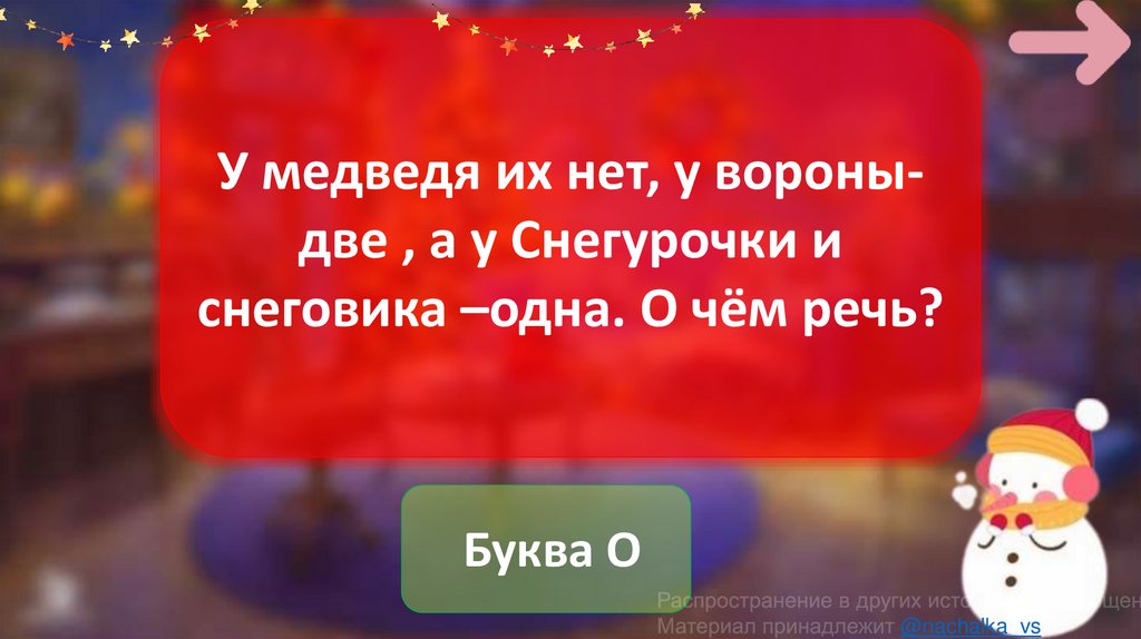 У медведя их нет, у вороныдве , а у Снегурочки иснеговика –одна. О чём речь?
