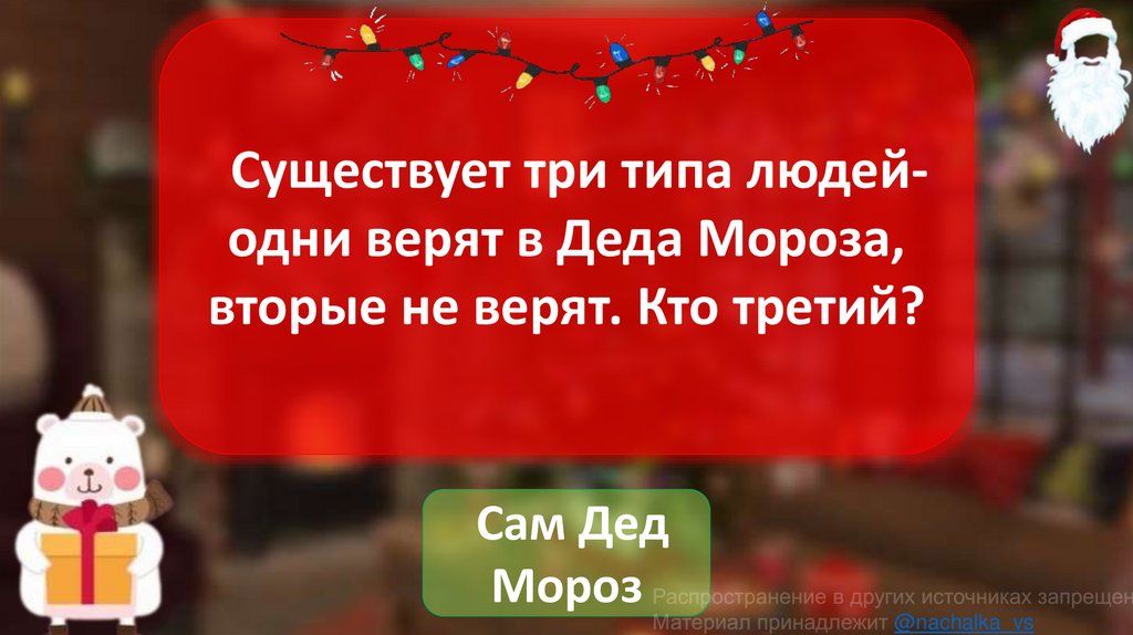 Существует три типа людейодни верят в Деда Мороза,вторые не верят. Кто третий?