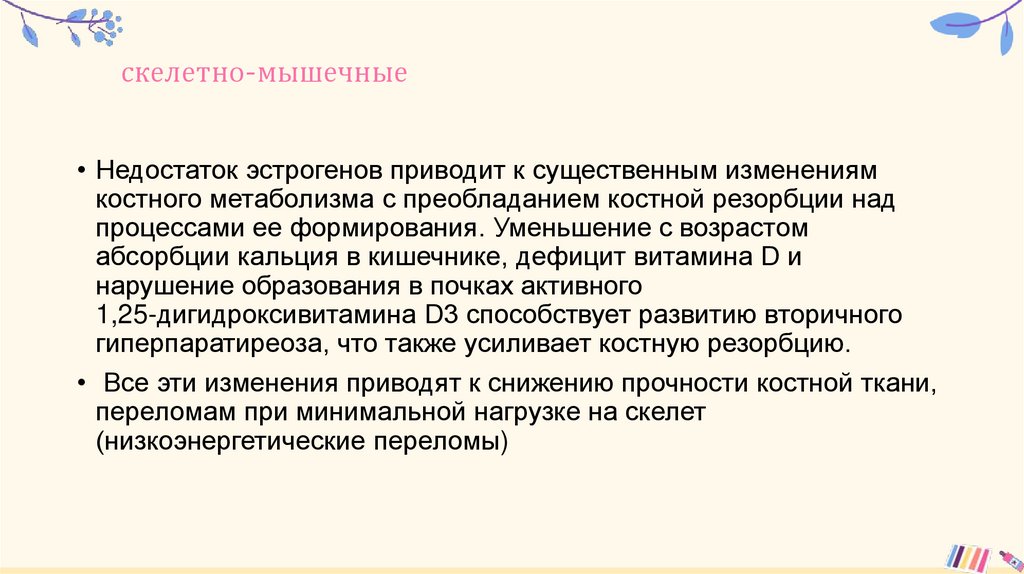 скелетно-мышечные• Недостаток эстрогенов приводит к существенным изменениям