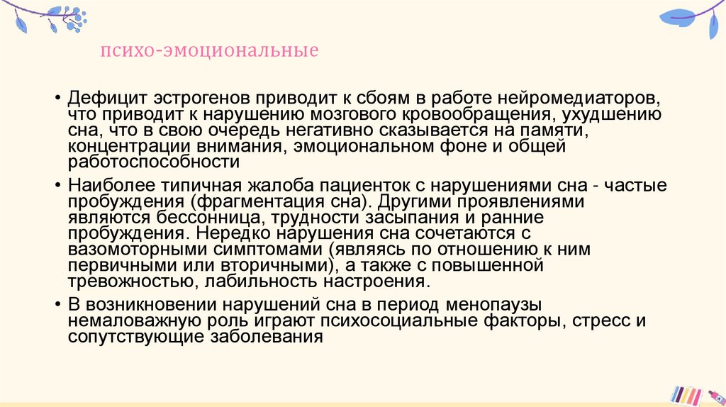 психо-эмоциональные• Дефицит эстрогенов приводит к сбоям в работе нейромедиаторов,