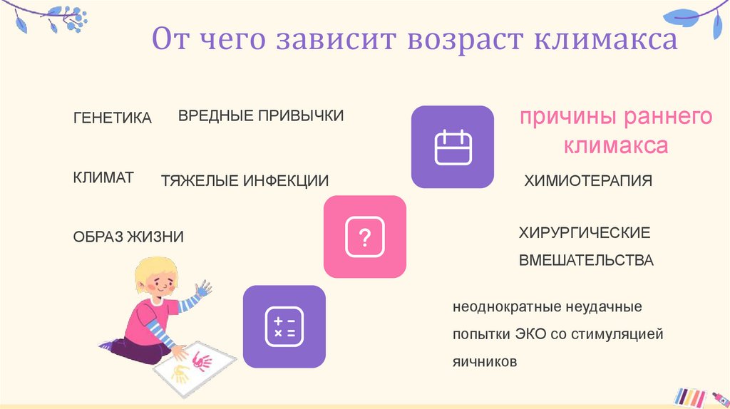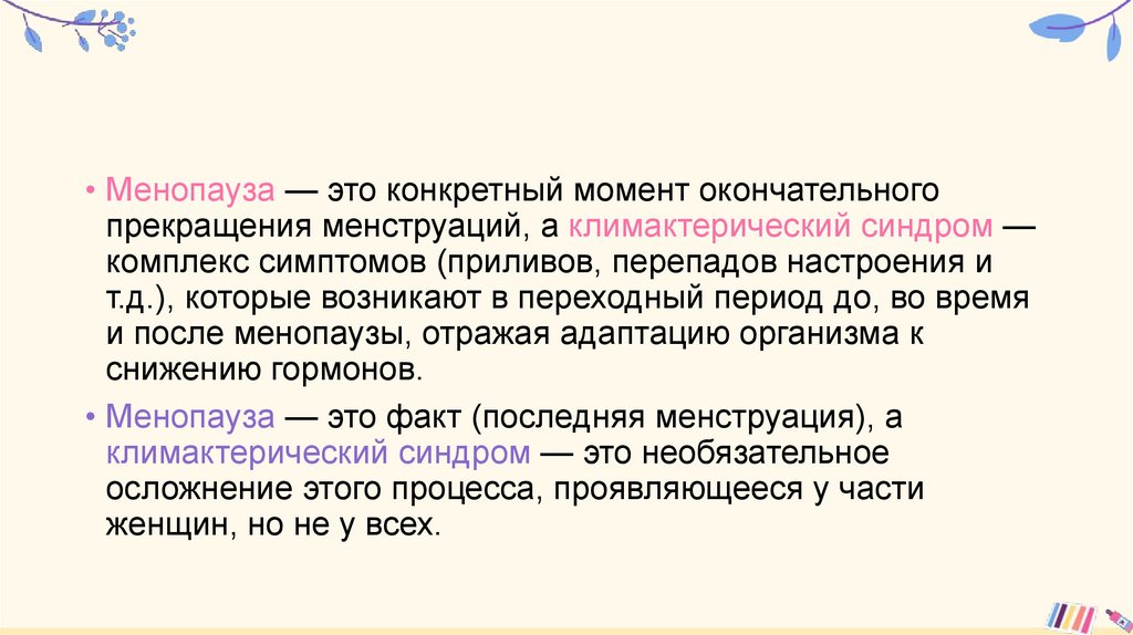 • Менопауза — это конкретный момент окончательногопрекращения менструаций, а климактерический синдром —
