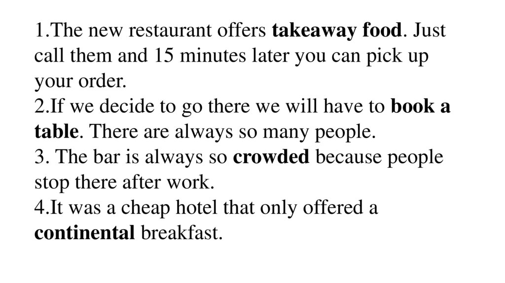 1.The new restaurant offers takeaway food. Justcall them and 15 minutes later you can pick up